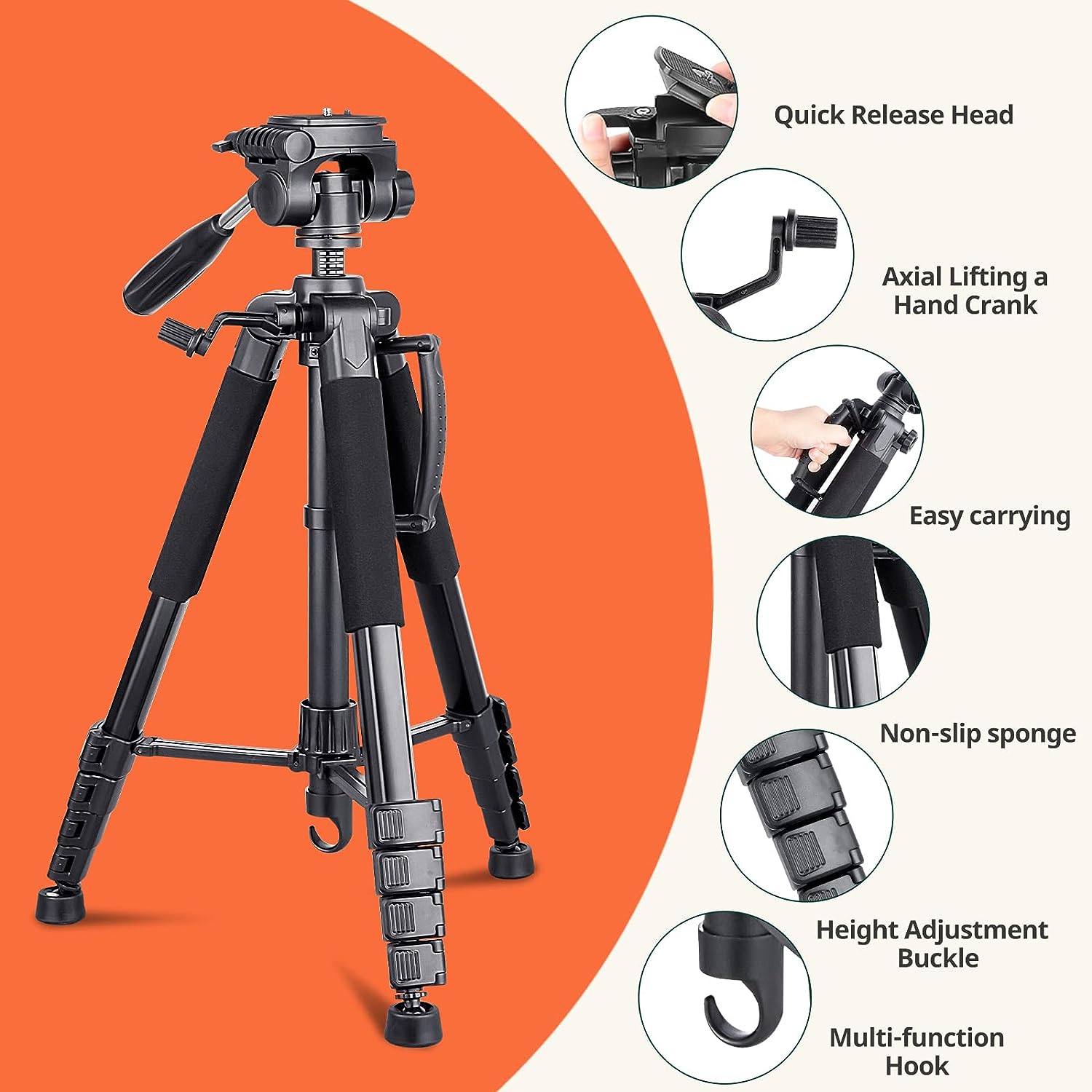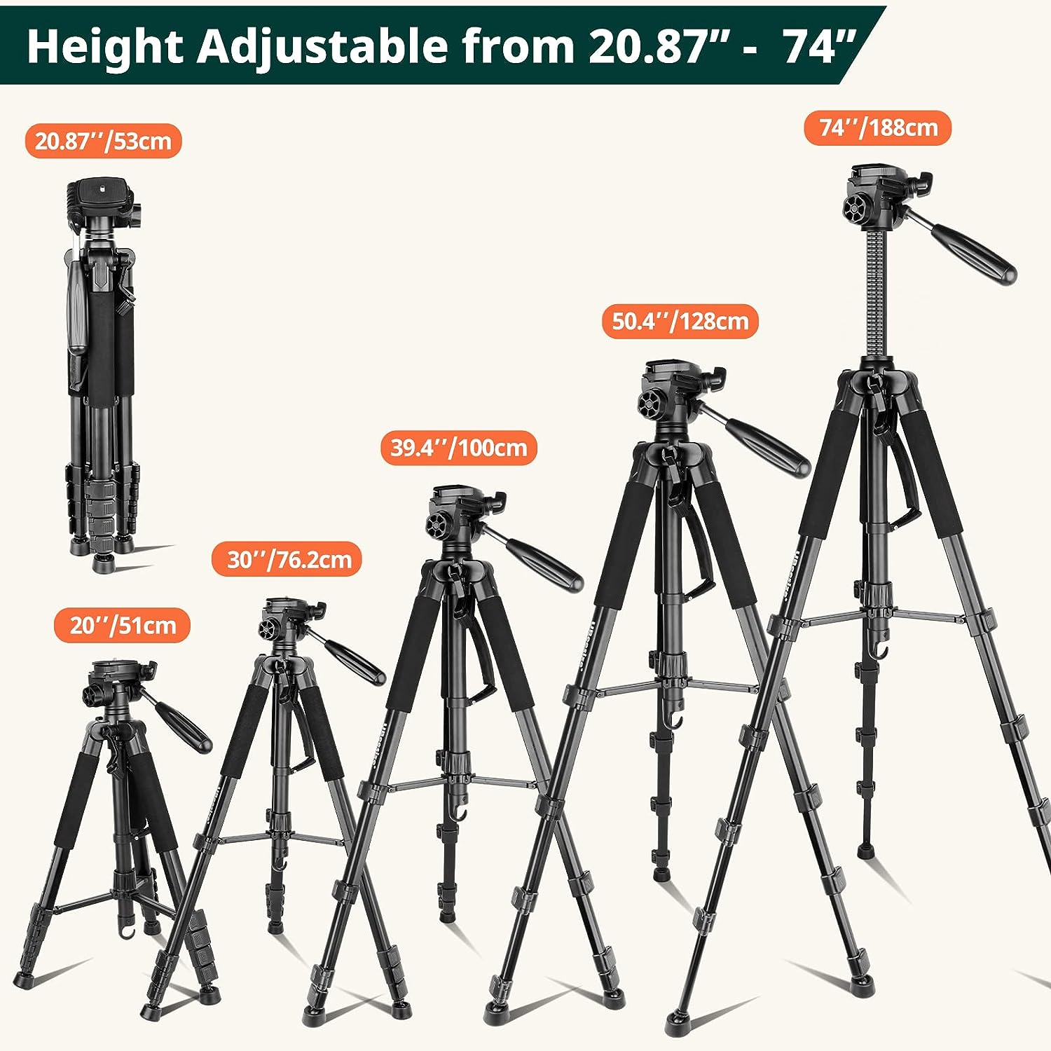 • 【Wide Compatibility】This camera tripod has a sturdy phone holder and 1/4 Universal Screw. And it can extend from 20.87 to 74in, this tripod fully for All Cameras(Nikon D3500/D7500, Canon m50 EOS rebel t6 t7, Olympus, Panasonic).